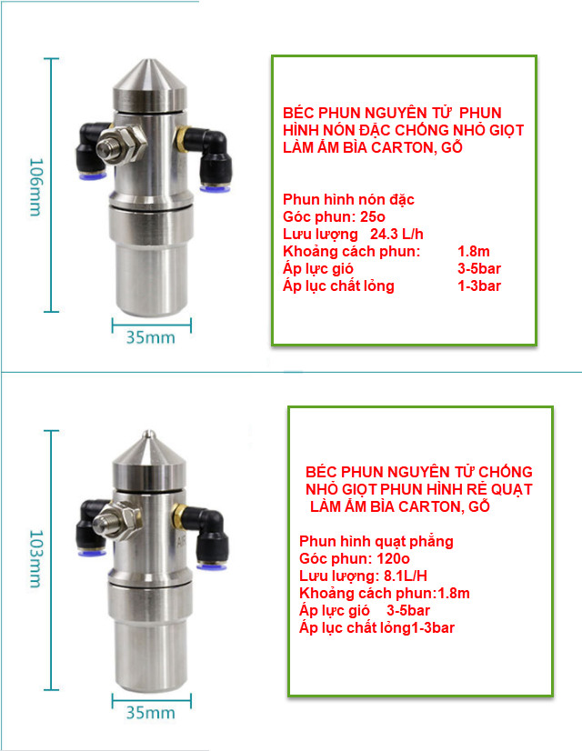 Phun chất lỏng bằng khí nén (AIR/LIQUID) nguyên tử hóa đồng đều chất lỏng tạo ra các hạt sương siêu mịn khoảng 5-10 micron tránh nhỏ giọt để dập bụi, tạo ẩm, phun khử trùng.